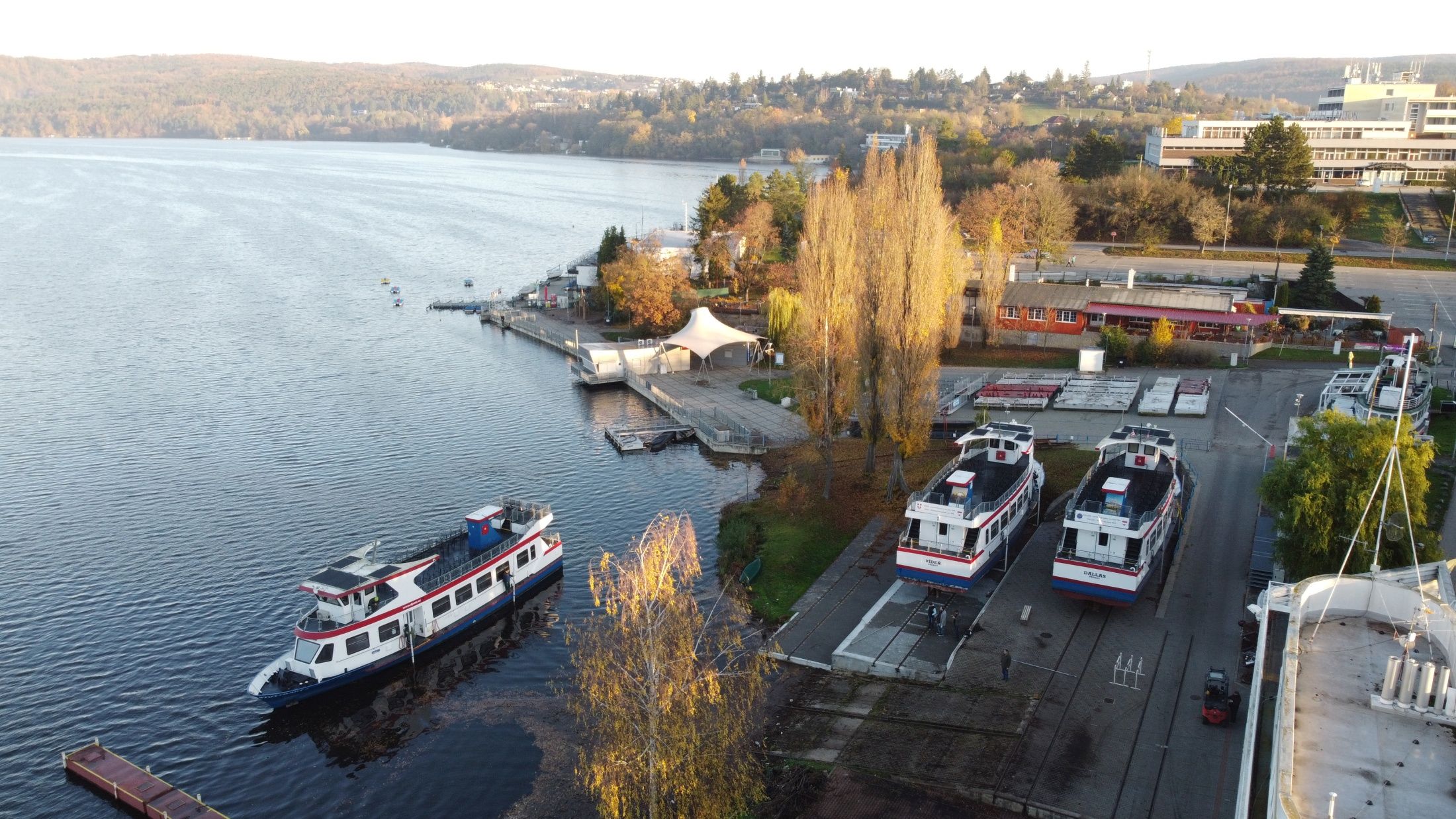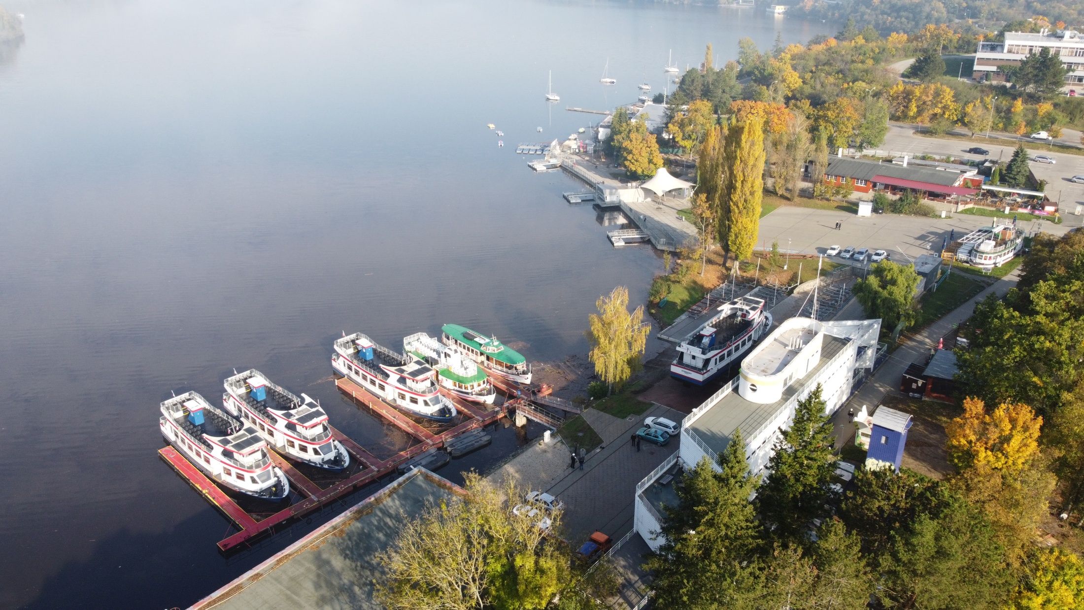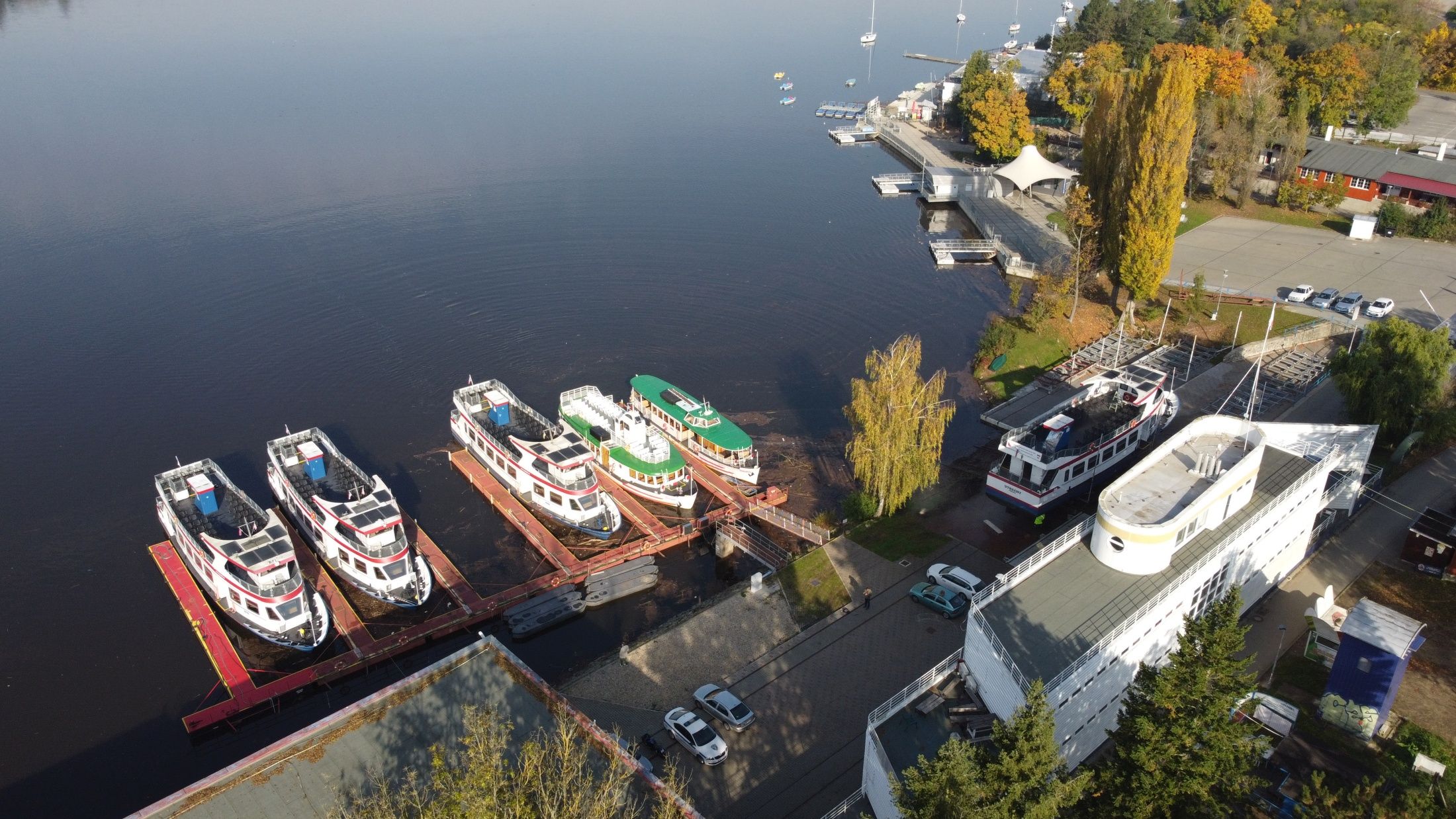 Zázemí brněnské lodní dopravy už od roku 1946. Současná budova z roku 1995 připomíná svým tvarem loď a ukrývá dílny, kanceláře i výpravnu pro lodě DPMB – místo, kde technika potkává kouzlo Brněnské přehrady.