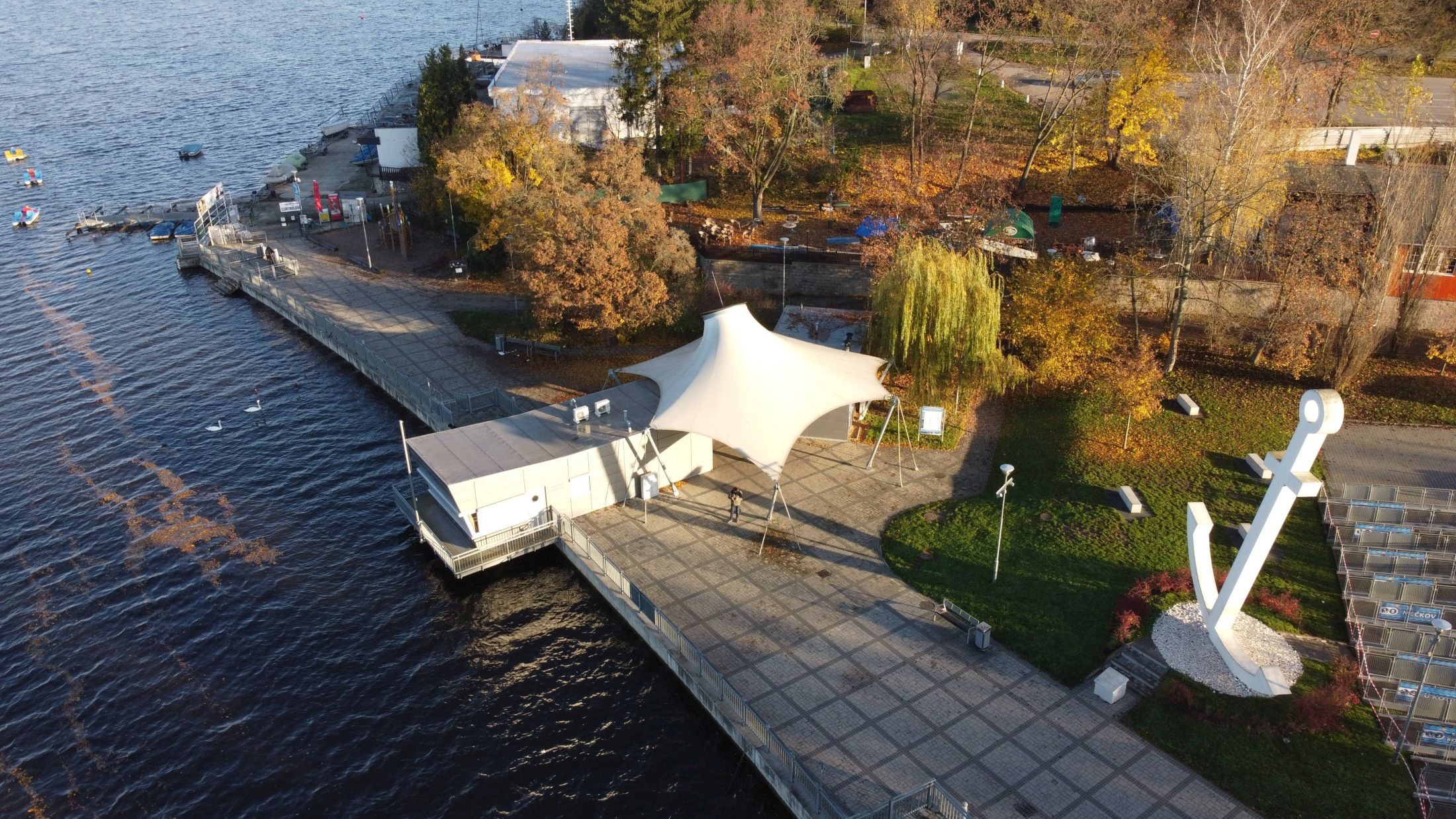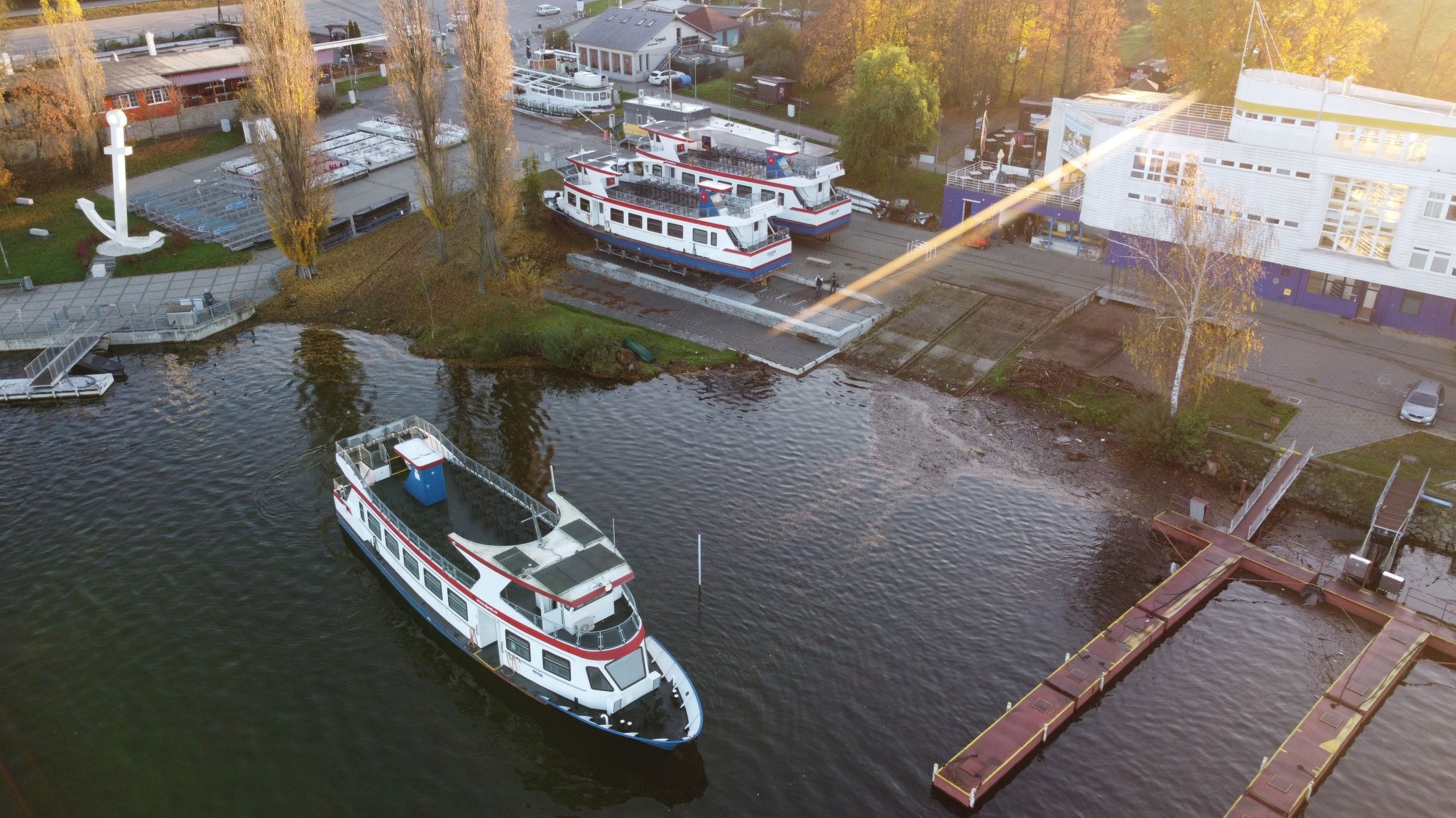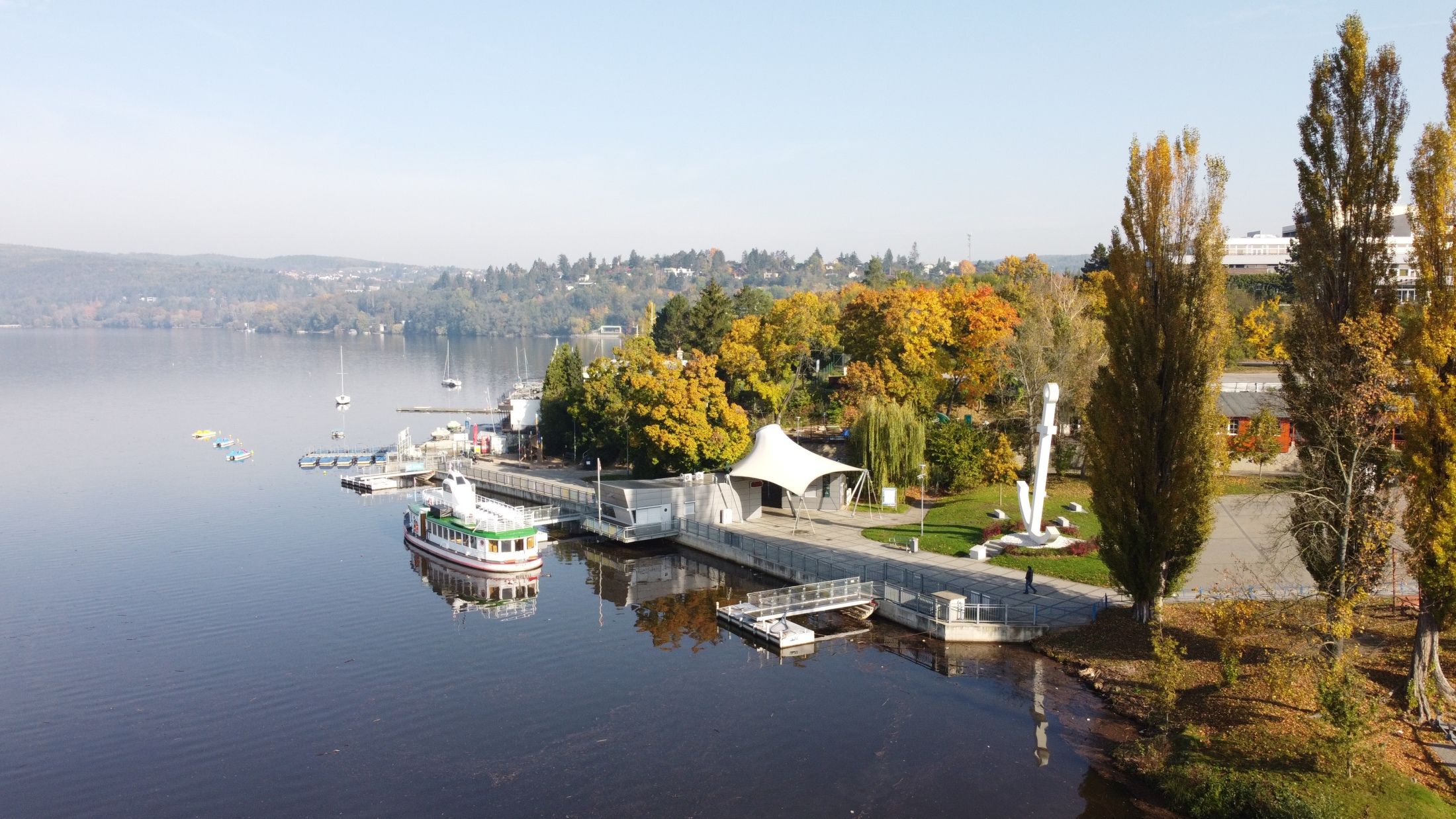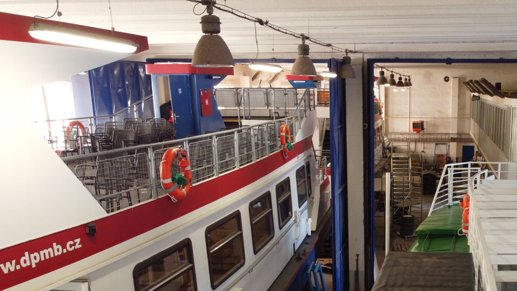 Zázemí brněnské lodní dopravy už od roku 1946. Současná budova z roku 1995 připomíná svým tvarem loď a ukrývá dílny, kanceláře i výpravnu pro lodě DPMB – místo, kde technika potkává kouzlo Brněnské přehrady.